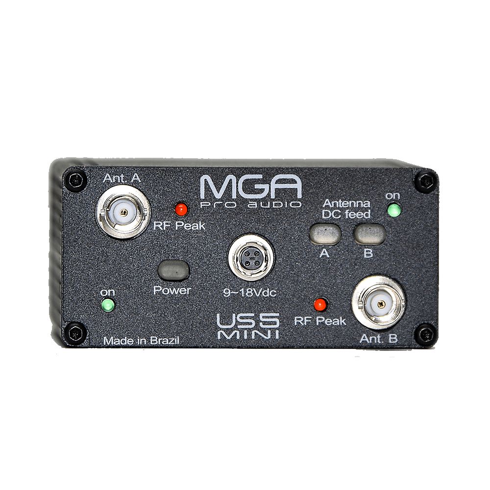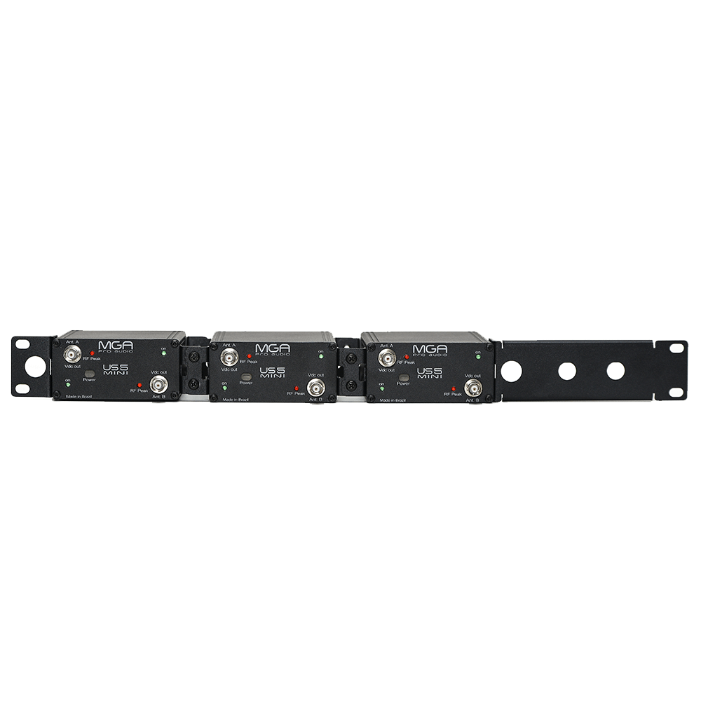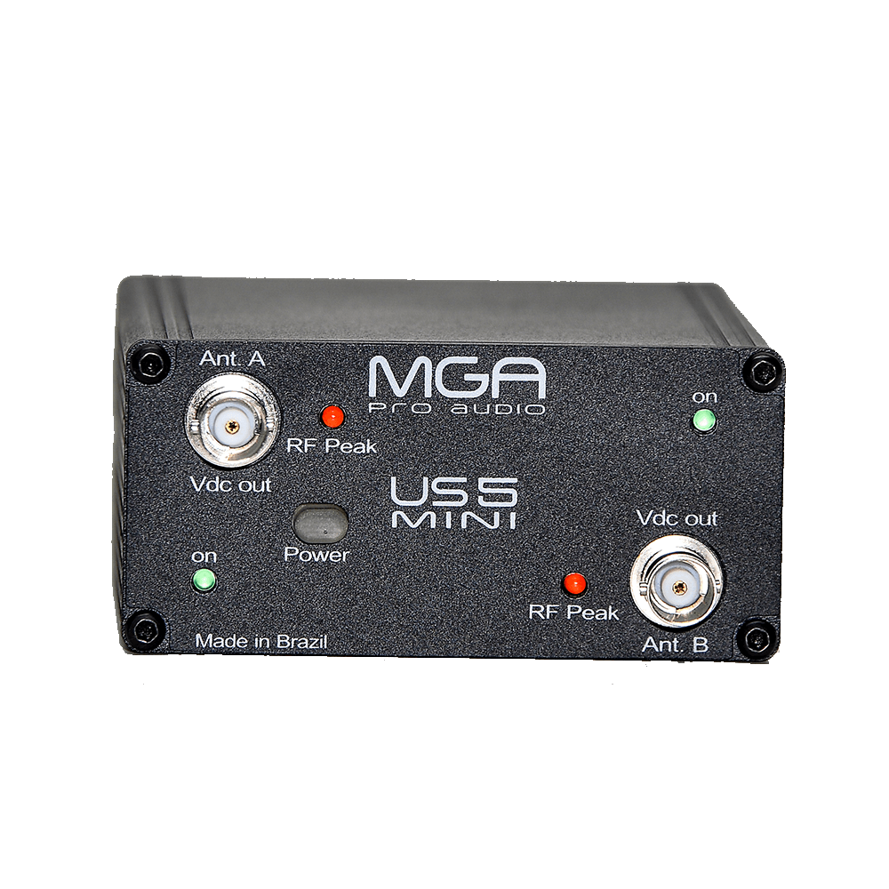 | Modelo Standard. Não acompanham fonte de alimentação e cabos. | Indicado para live Sound. Kit completo com cabos, fonte de alimentação e sistema defixação para rack. | Com entrada de alimentação frontal e chave de acionamento para os bias A e B (não acompanham cabos e fonte de alimentação). | Todos os recursos do Mini US-5 HR mais dois conversores DC/DC que regulam a tensão de bias das entradas A e B (não acompanham cabos e fonte de alimentação). | |